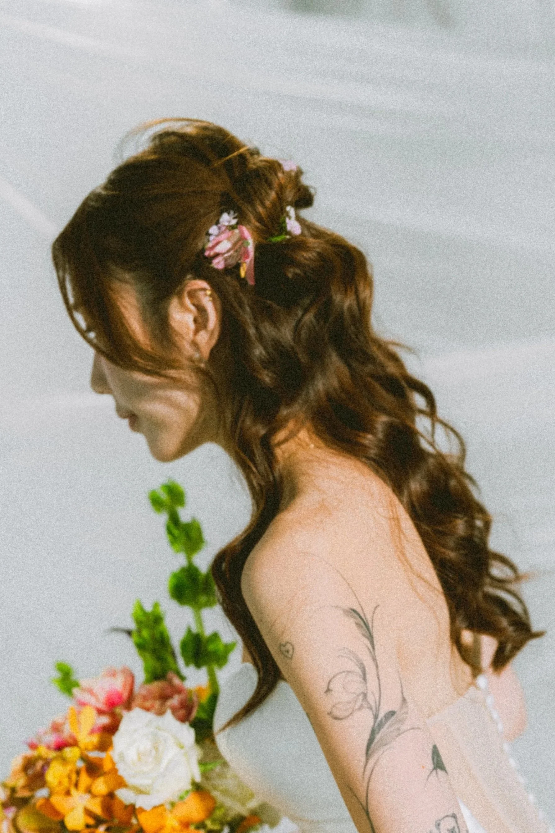 The hair for this shoot was styled into a half side-do, designed to feel light, airy, and feminine. Soft waves framed the face gently, creating movement and softness that complemented the floral setting. Ribbon twists were woven into the hair, alongside delicate florals, adding an ethereal and whimsical touch.